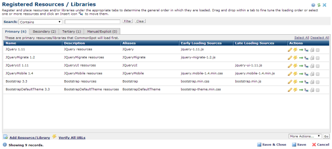 Each resource consists of a name, description, a set of resource URLs, along with distribution rights information, and optional aliases for loading it. Resources load their files (Resource URLs) into one of three Resource Groups - Primary, Secondary, and Tertiary, which reflect load order within the categories of Early (<head> section) or Late (just before the </body> tag) displayed here